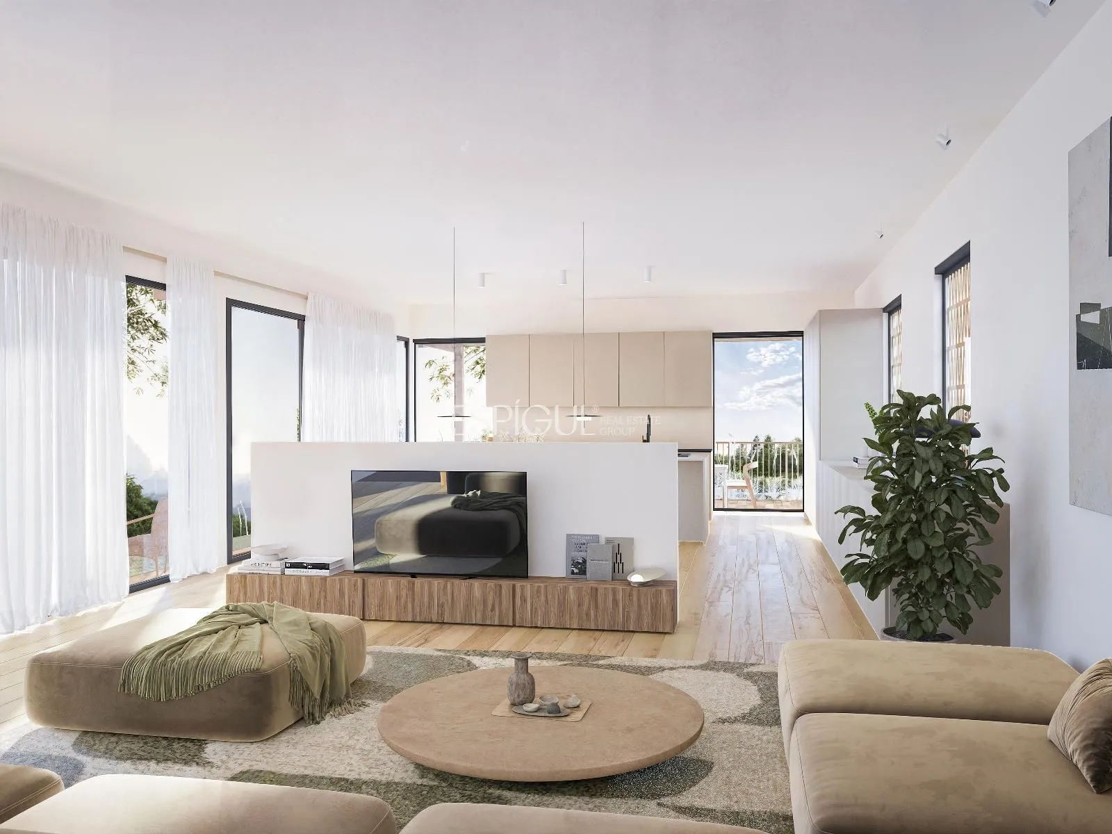 En la planta baja, el concepto de espacio abierto se hace protagonista: un recibidor elegante da paso al salón-comedor con cocina abierta totalmente equipada, con grandes ventanales que comunican directamente con el jardín y la piscina.