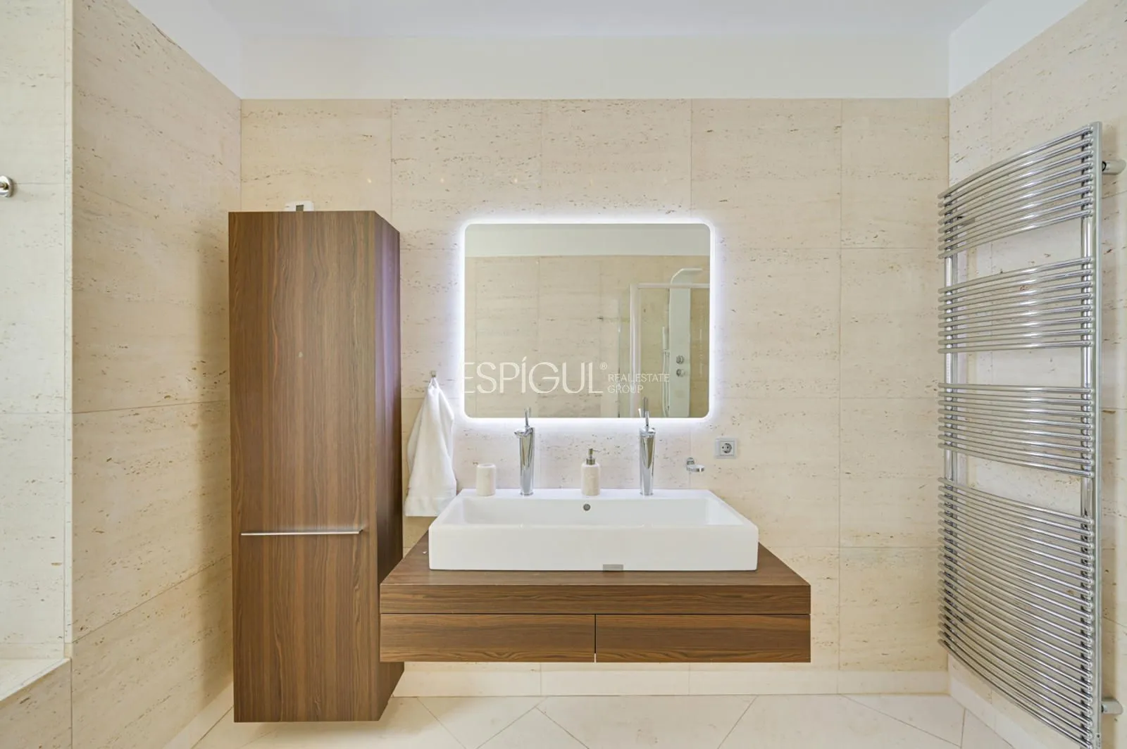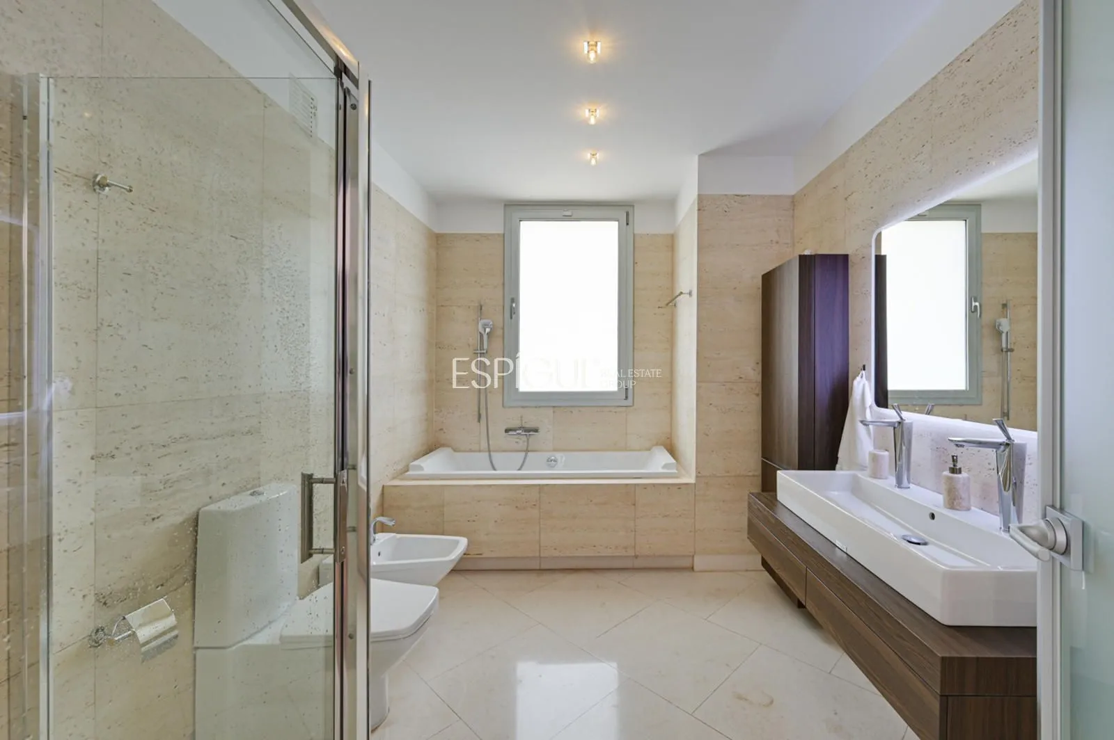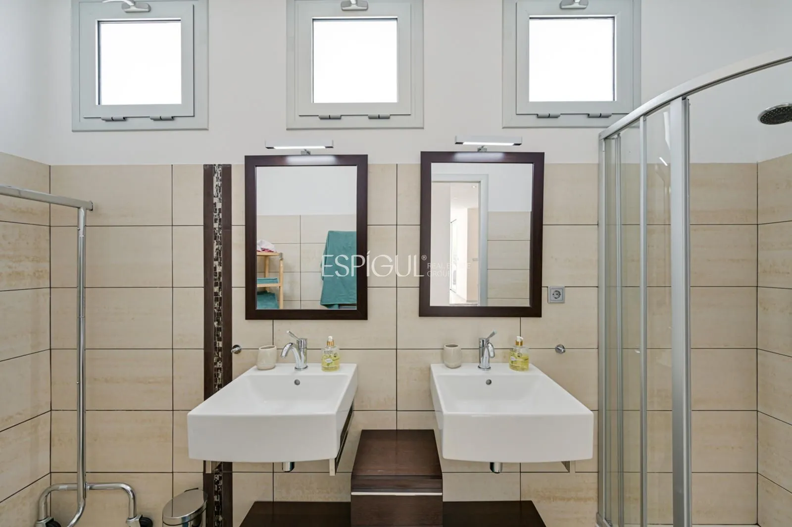 En el nivel superior se sitúa la zona de descanso, presidida por una majestuosa master suite con baño completo, vestidor de ensueño y acceso a una terraza privada con vistas panorámicas al mar. A esta estancia la acompañan otra suite completa, dos habitaciones dobles adicionales (una de ellas actualmente reconvertida en vestidor), y un cuarto de baño completo.