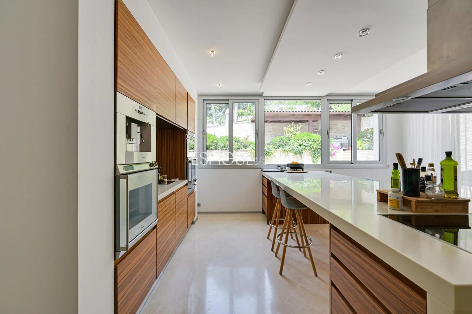 Accedemos a la vivienda a través de un elegante recibidor que da paso a un impresionante salón-comedor con grandes ventanales que integran el interior con el jardín, permitiendo disfrutar de las vistas desde cualquier ángulo. La cocina, de grandes dimensiones y completamente equipada con electrodomésticos de alta gama, es perfecta tanto para el día a día como para organizar reuniones familiares o con amigos. Esta planta cuenta además con una habitación tipo suite ideal para invitados o para despacho, y una práctica zona de lavandería independiente.