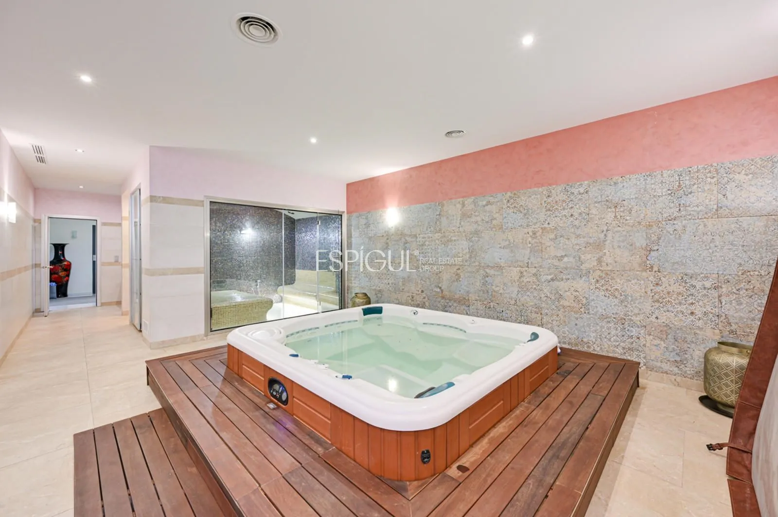 El sótano es otro de los grandes atractivos de la casa. Aquí encontramos una elegante sala polivalente con chimenea, perfecta para cine en casa, reuniones o zona de juegos, además de una exclusiva área wellness con jacuzzi para seis personas, sauna y baño completo. La planta se completa con un amplio garaje con capacidad para hasta seis vehículos.