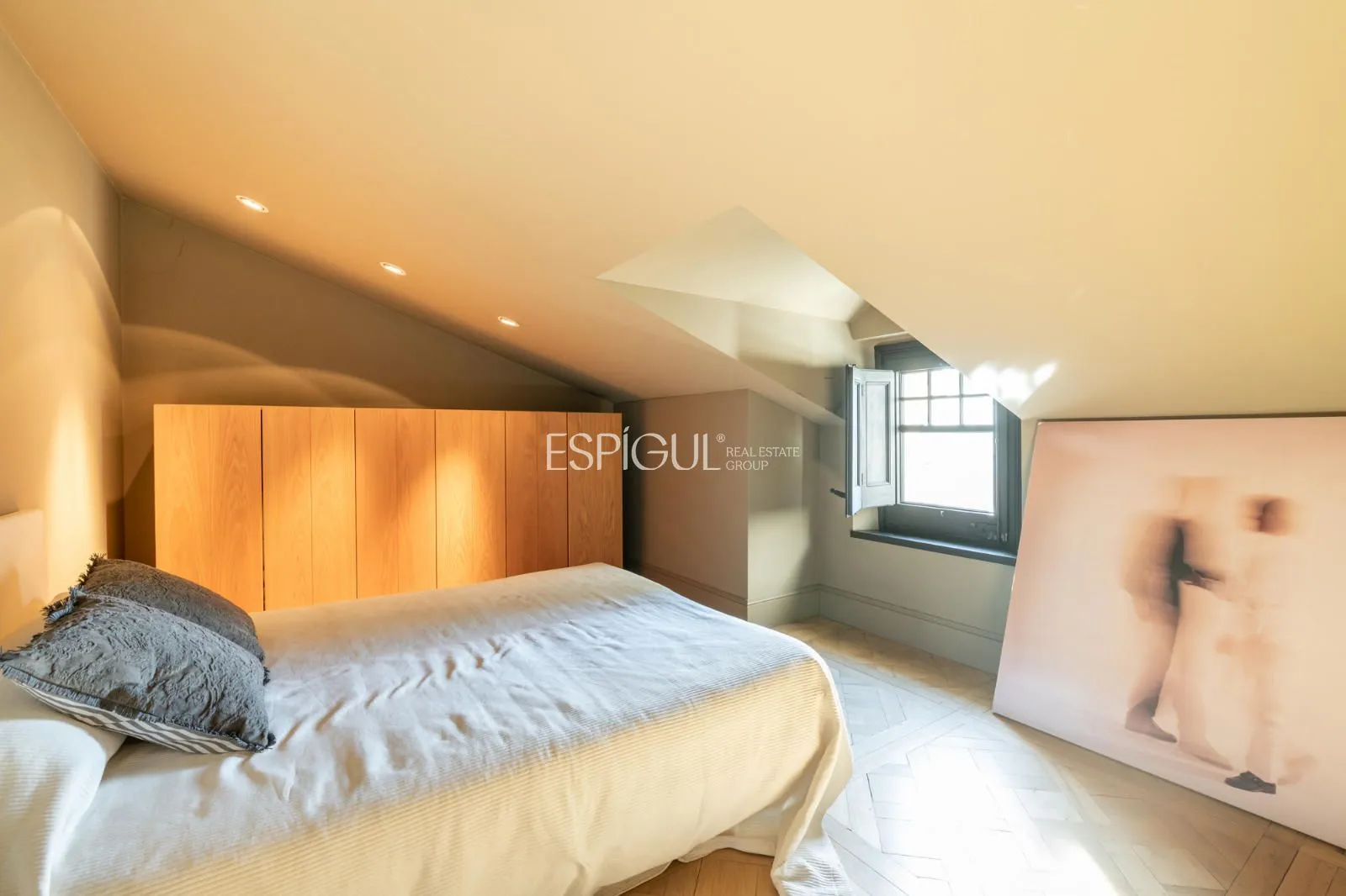 Segunda planta (buhardilla): espacio diáfano con techos altos, dos dormitorios dobles y un baño. Ideal para estudio, sala polivalente o zona de descanso.