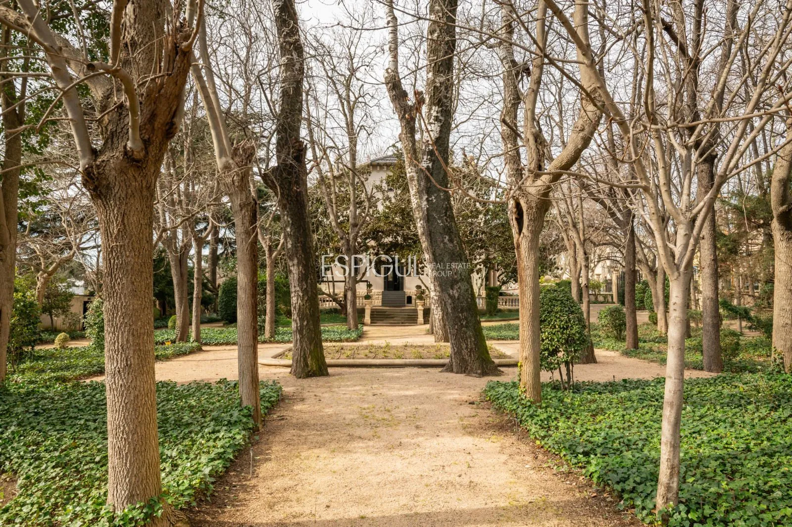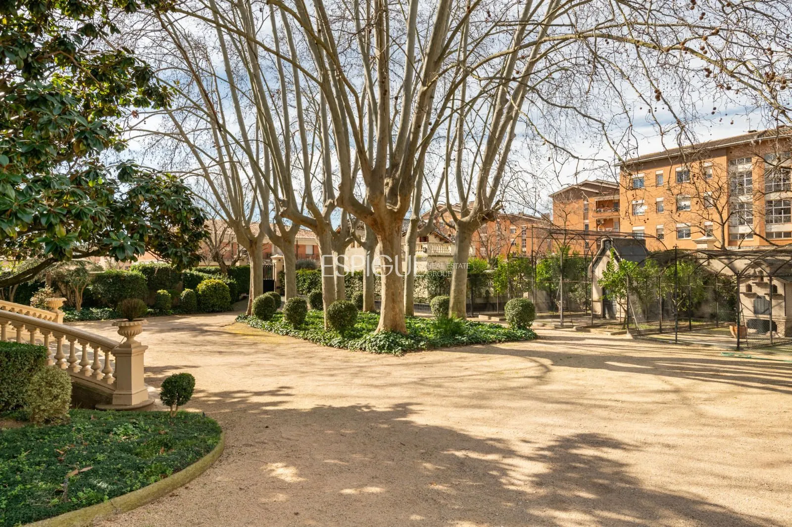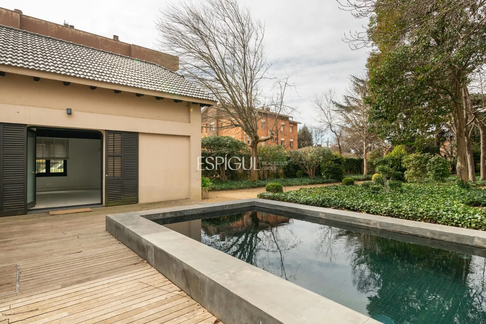 Jardín consolidado con arboles centenarios, piscina y vivienda anexa.