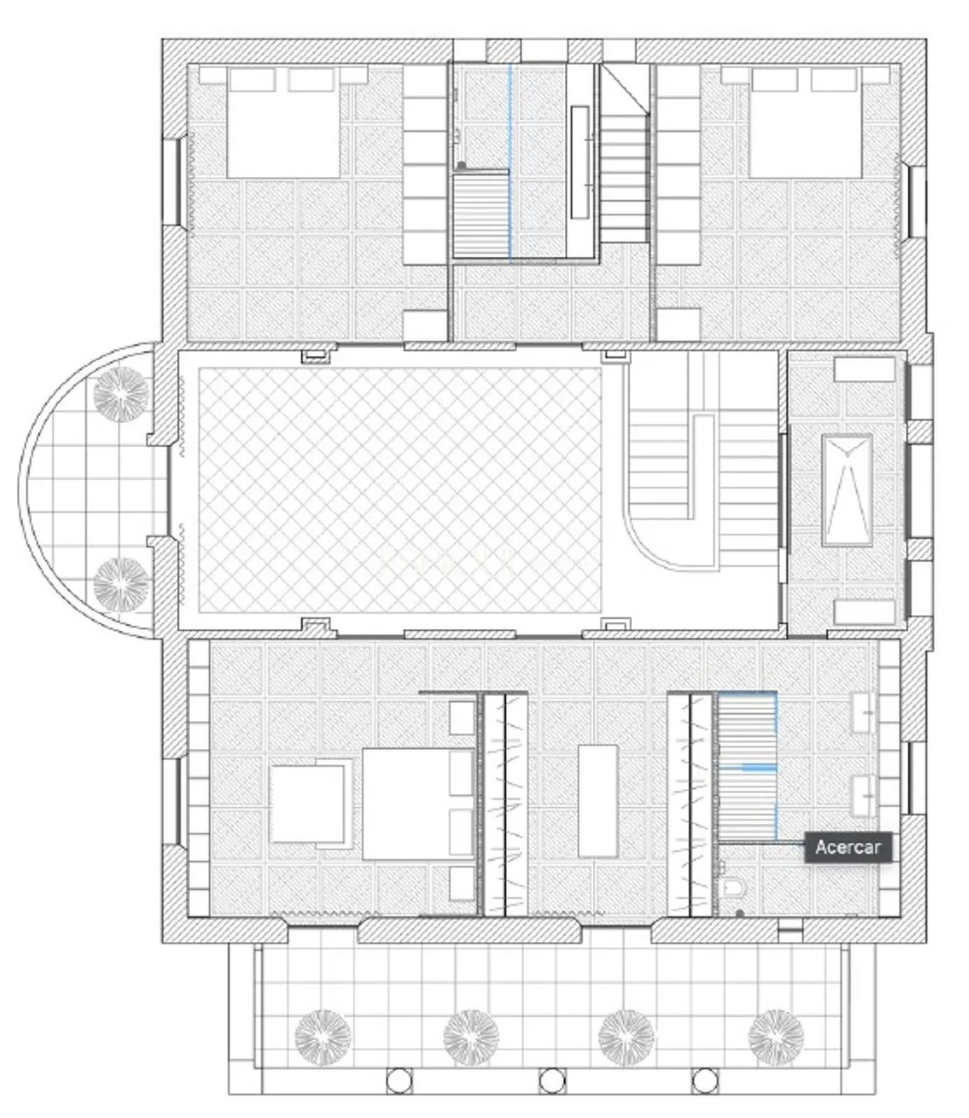 Primera planta: tres suites con baño privado y una sala central que aporta equilibrio y amplitud al conjunto.