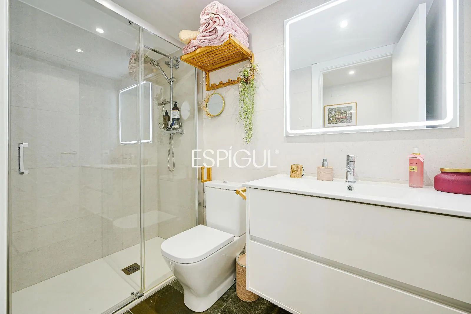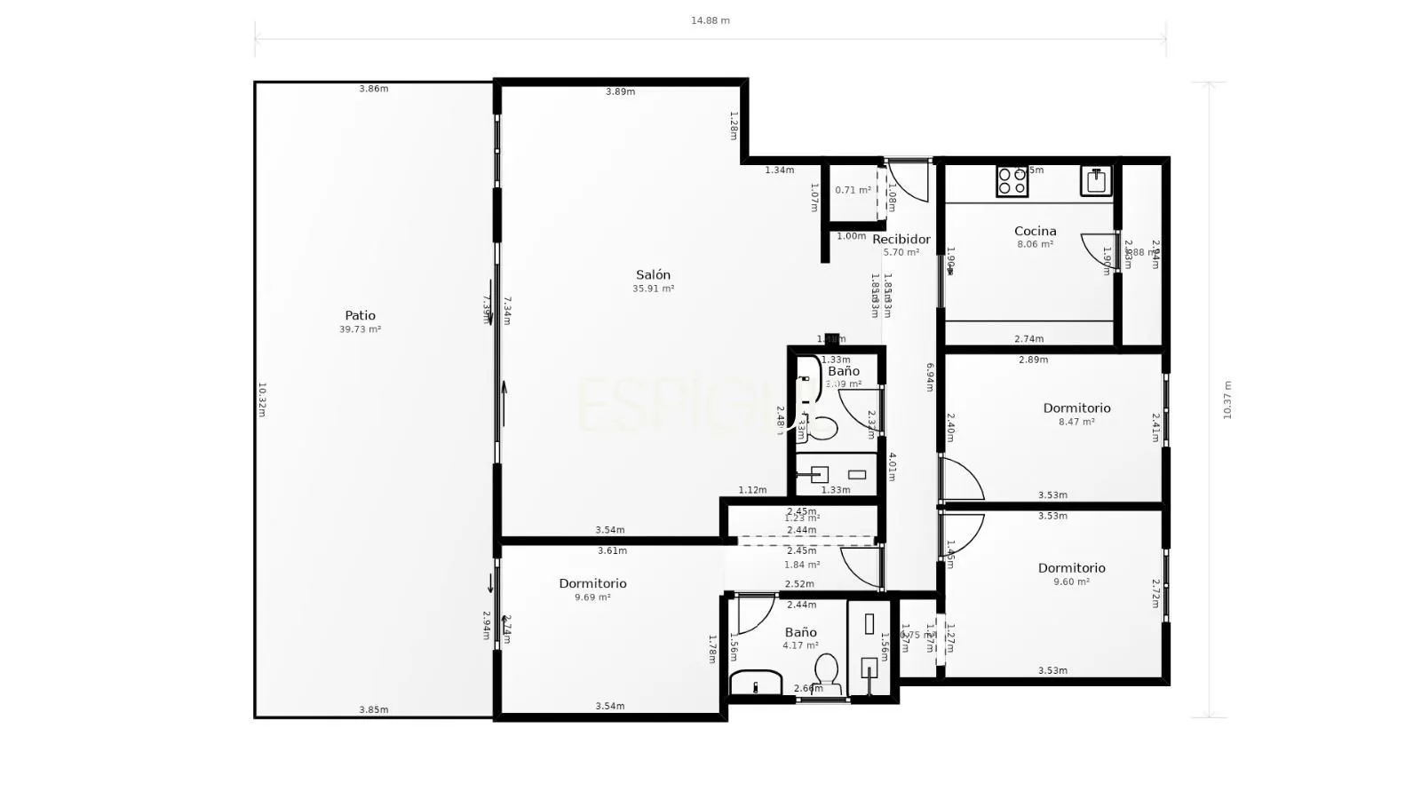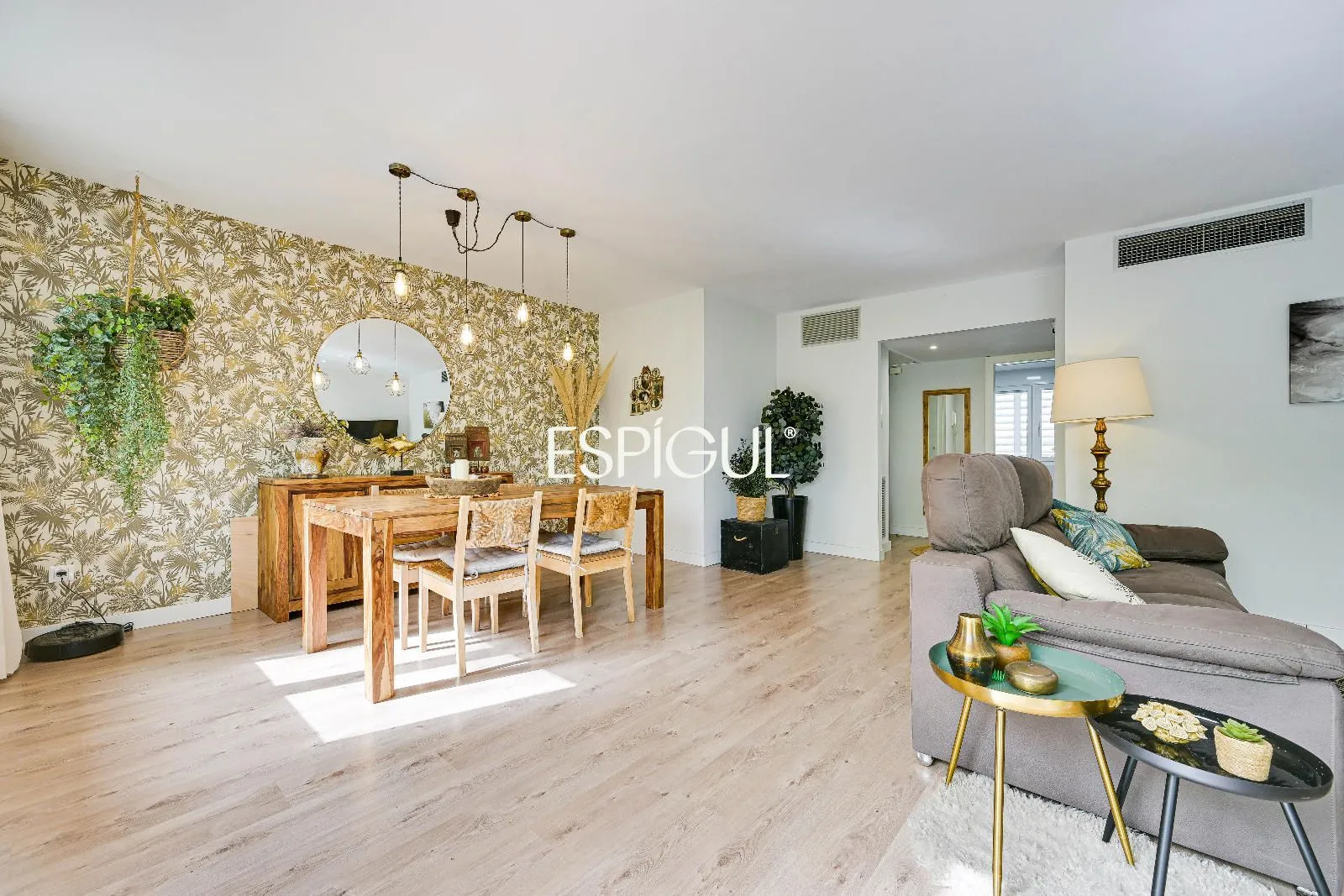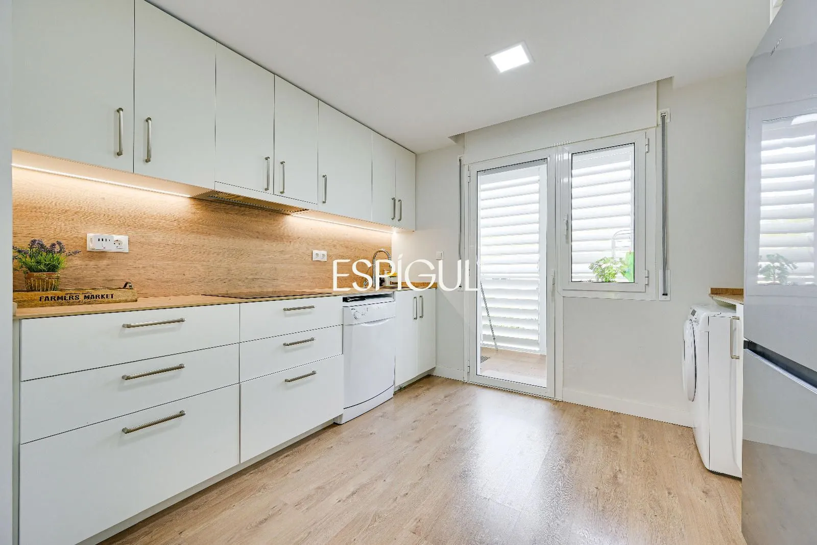 Le cœur du logement est son salon-salle à manger accueillant, baigné d’une abondante lumière naturelle, qui se connecte directement à une grande terrasse privée. Cet espace extérieur est parfait pour profiter du climat méditerranéen, que ce soit pour se détendre au soleil, partager des repas en plein air ou créer un agréable coin détente dans un environnement tranquille.