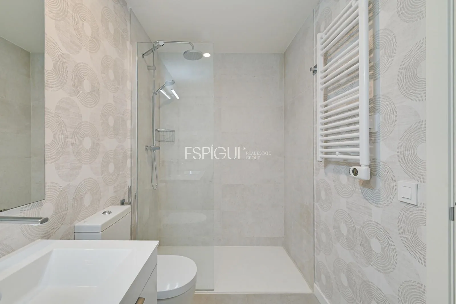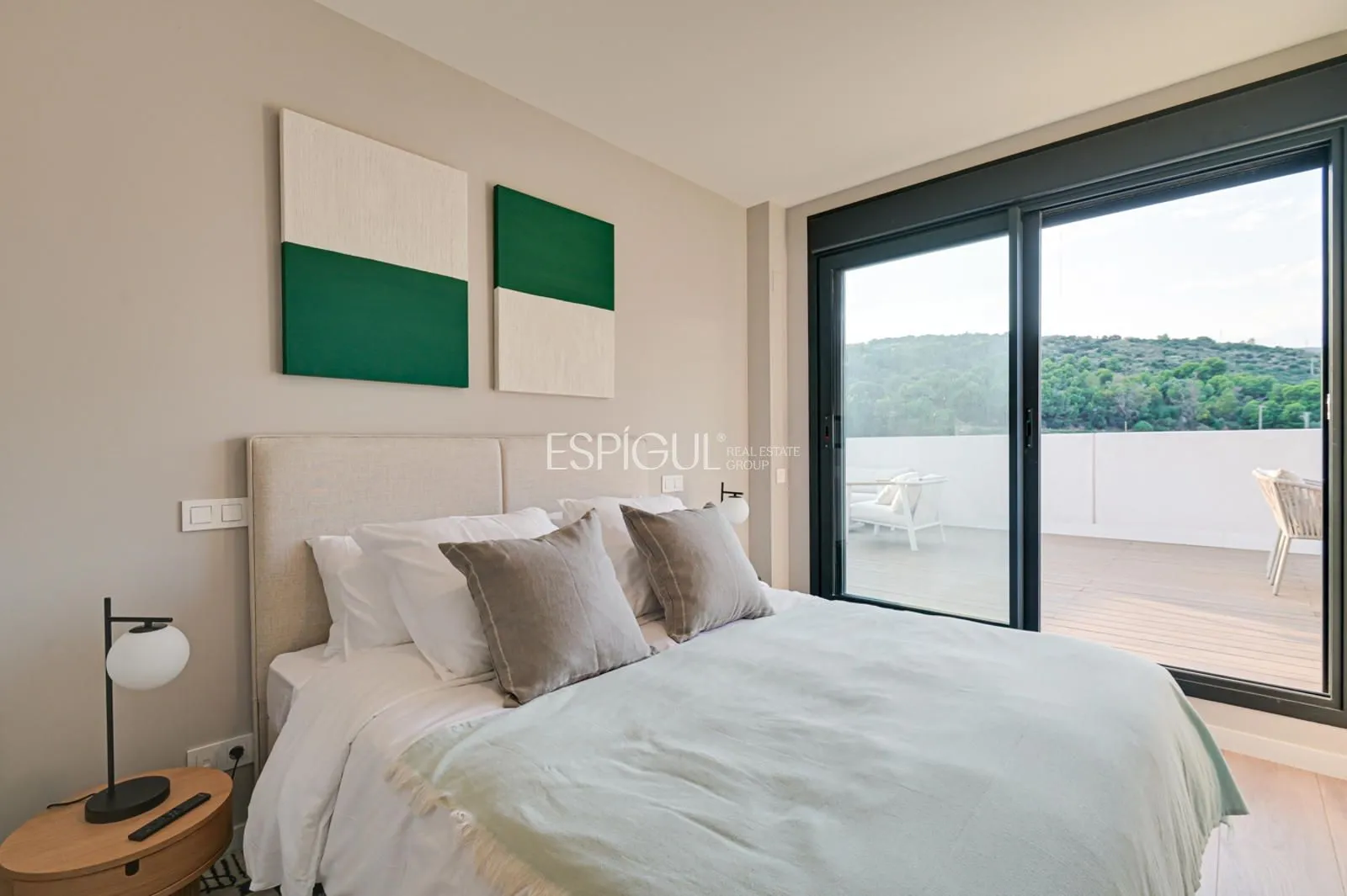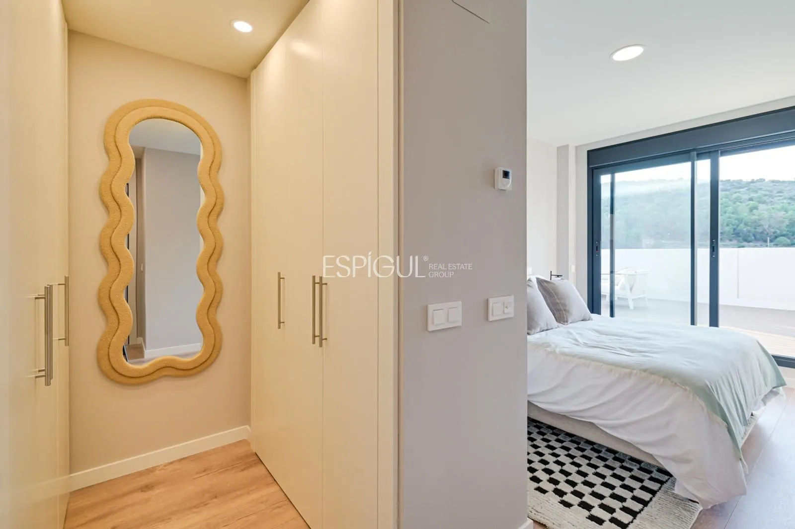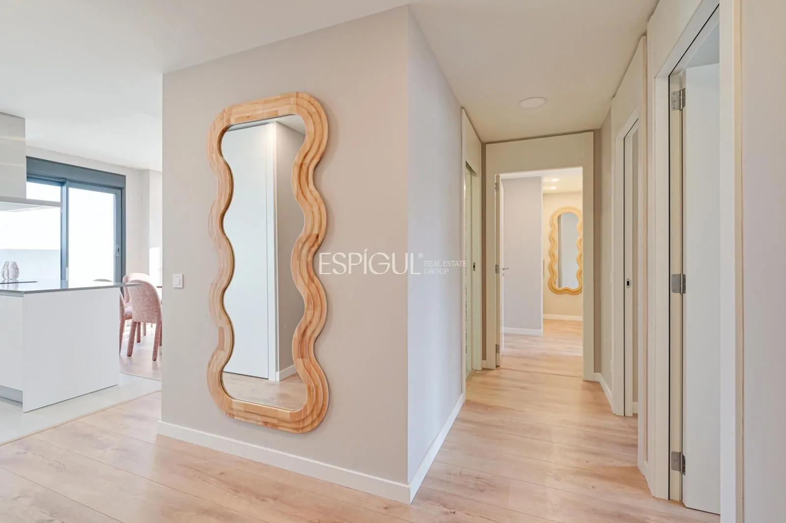 Le logement offre un salon-salle à manger lumineux, dominé par une grande baie vitrée avec accès direct à la terrasse, une cuisine design ouverte et entièrement équipée, une élégante suite principale avec dressing et deux chambres doubles avec placards intégrés qui partagent une salle de bain complète.