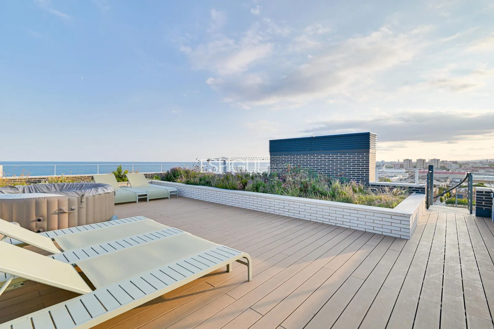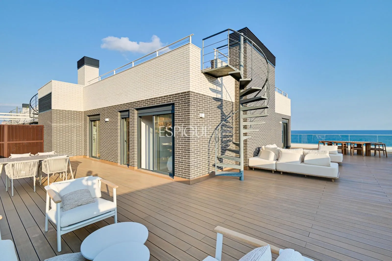 Attique en duplex exclusif de construction neuve à Montgat, à seulement 100 mètres de la mer, avec 150 m² construits et entouré d’une imposante terrasse périphérique de 158 m², ainsi que d’un solarium privé de 64 m² offrant des vues panoramiques spectaculaires sur la mer et la montagne.