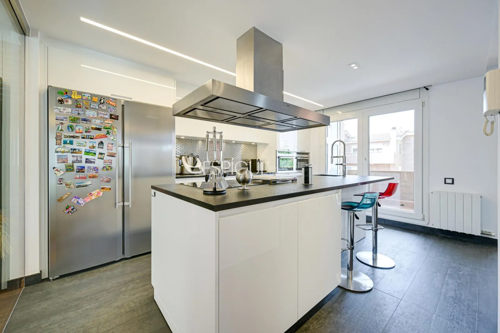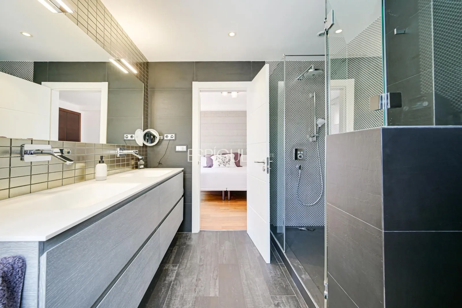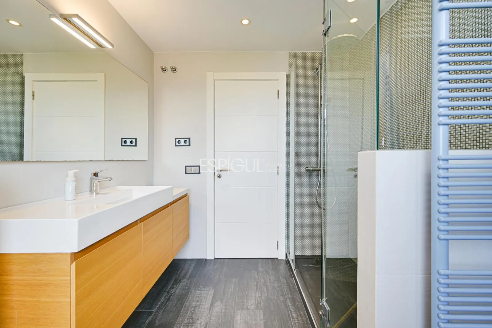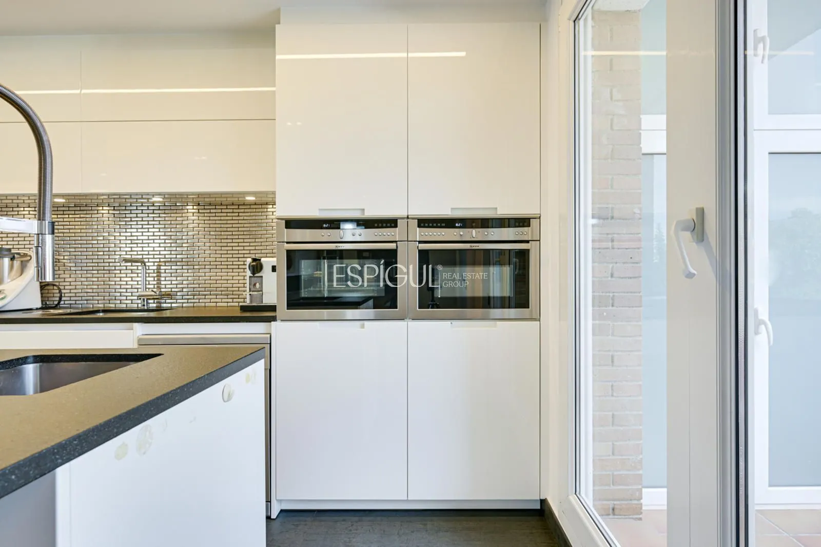 Étage principal (espace de jour) : salon spectaculaire avec cuisine à concept ouvert, entièrement équipée avec des appareils haut de gamme NEFF (four à vapeur et micro-ondes intégrés), teppanyaki, installations dissimulées dans le plan de travail, emplacement pour double réfrigérateur et système de collecte des déchets organiques. Il dispose également d’une buanderie indépendante avec ventilation naturelle, de toilettes pour invités et d’un accès direct à la terrasse et au jardin privé avec piscine, pergola, porche, espace barbecue et cuisine extérieure.