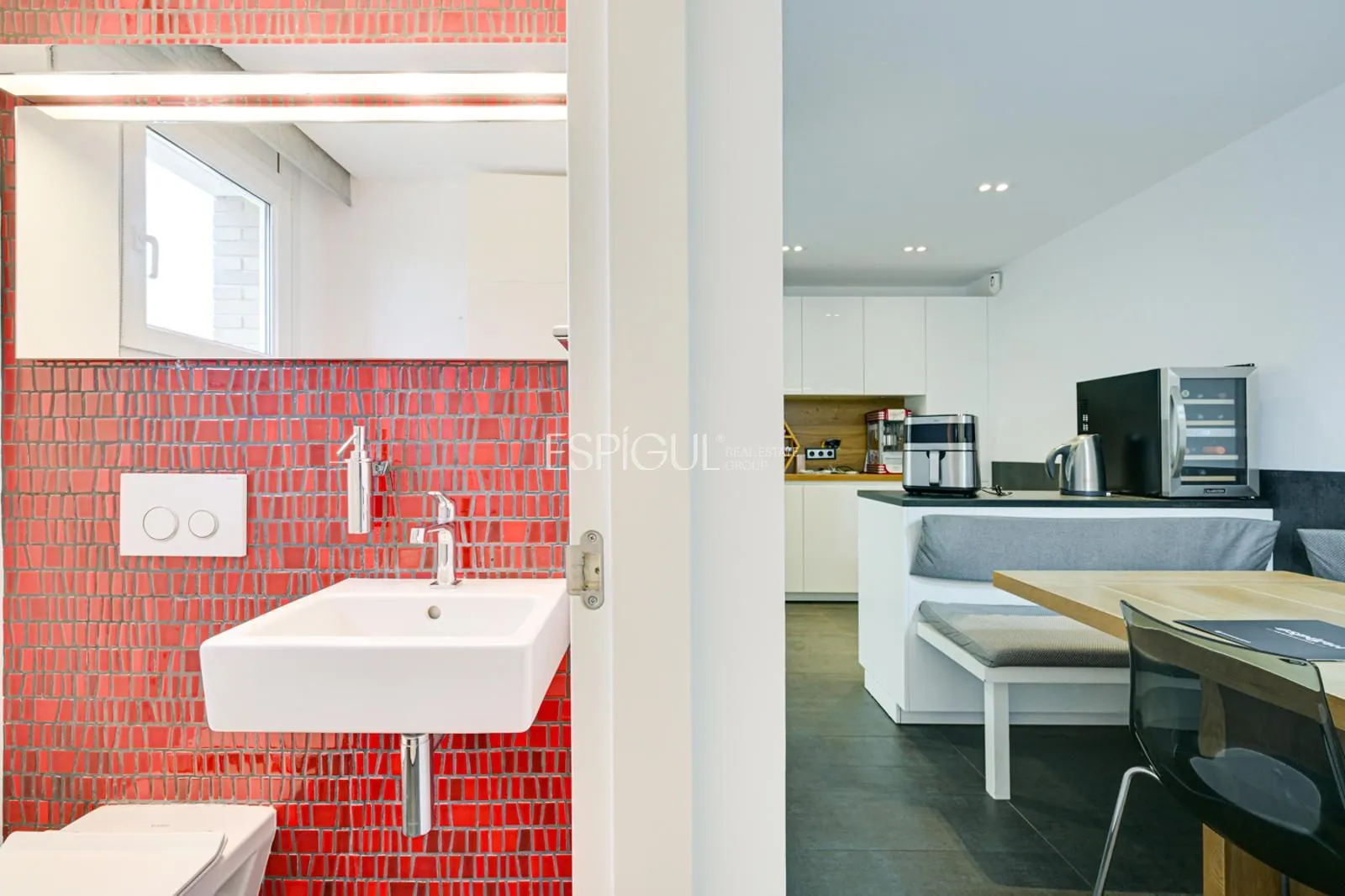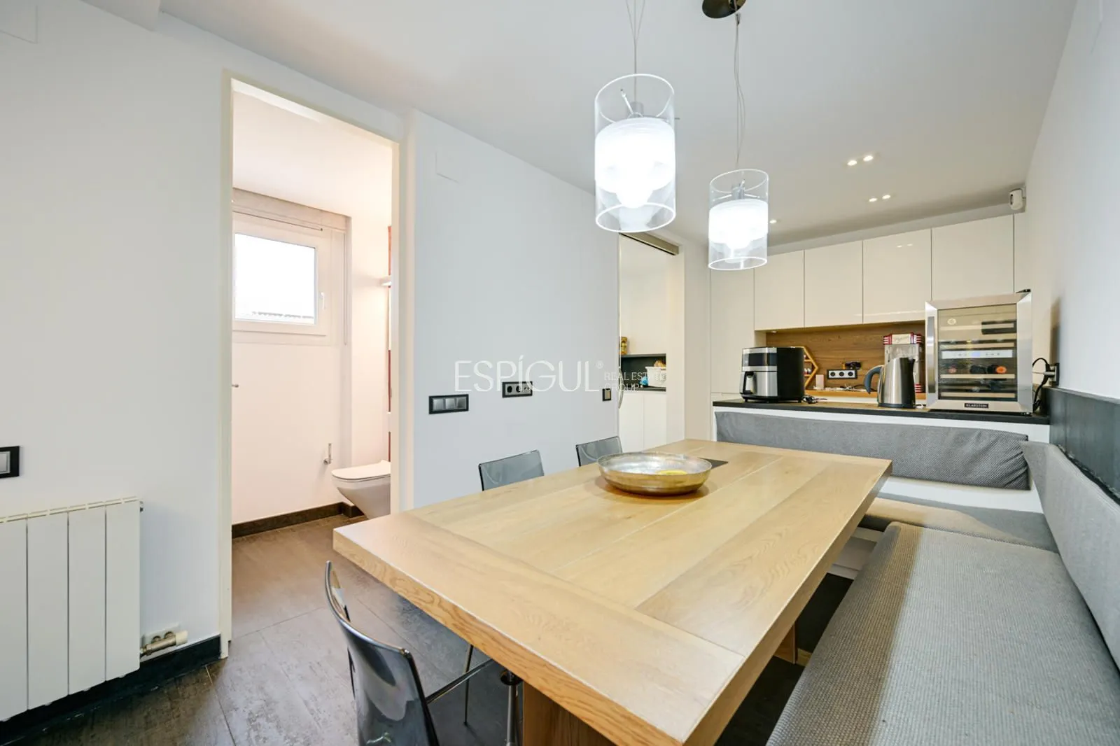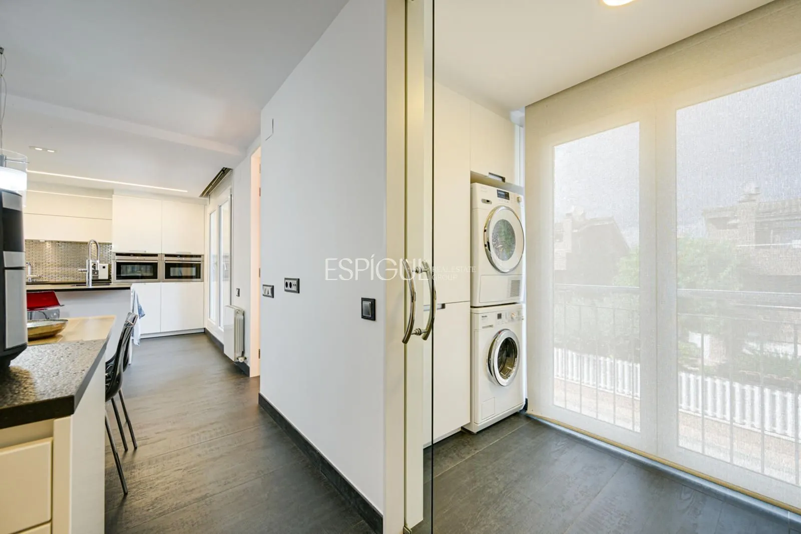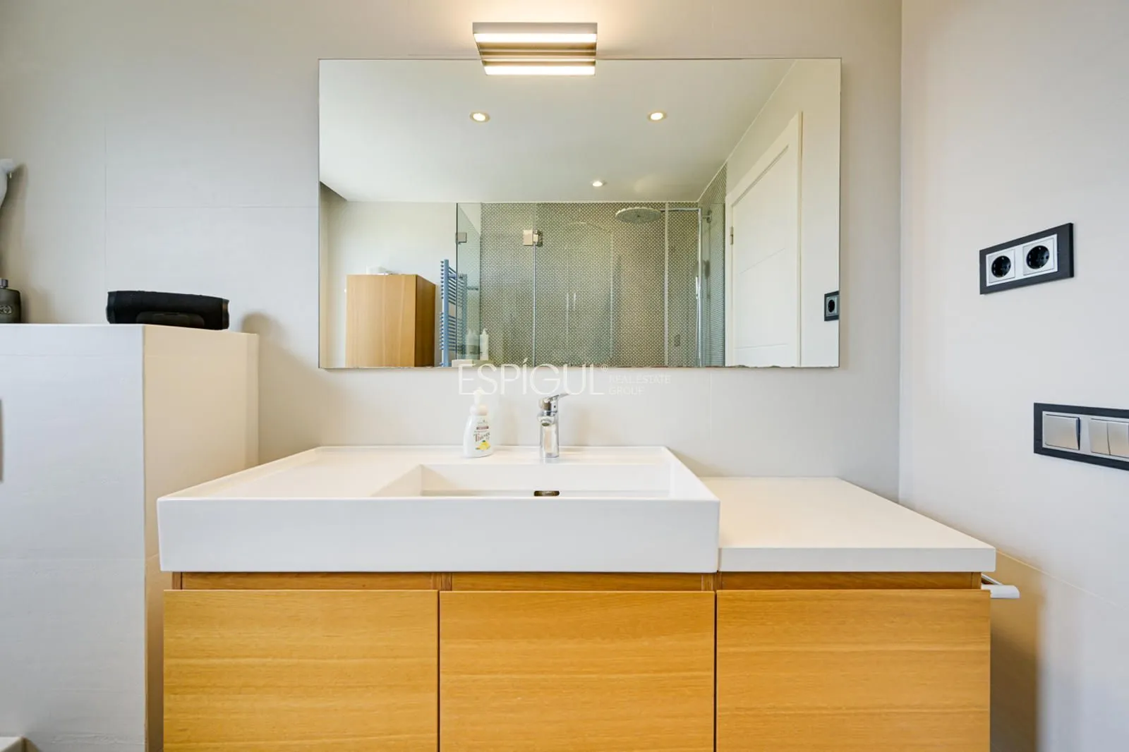 Étage principal (espace de jour) : salon spectaculaire avec cuisine à concept ouvert, entièrement équipée avec des appareils haut de gamme NEFF (four à vapeur et micro-ondes intégrés), teppanyaki, installations dissimulées dans le plan de travail, emplacement pour double réfrigérateur et système de collecte des déchets organiques. Il dispose également d’une buanderie indépendante avec ventilation naturelle, de toilettes pour invités et d’un accès direct à la terrasse et au jardin privé avec piscine, pergola, porche, espace barbecue et cuisine extérieure.