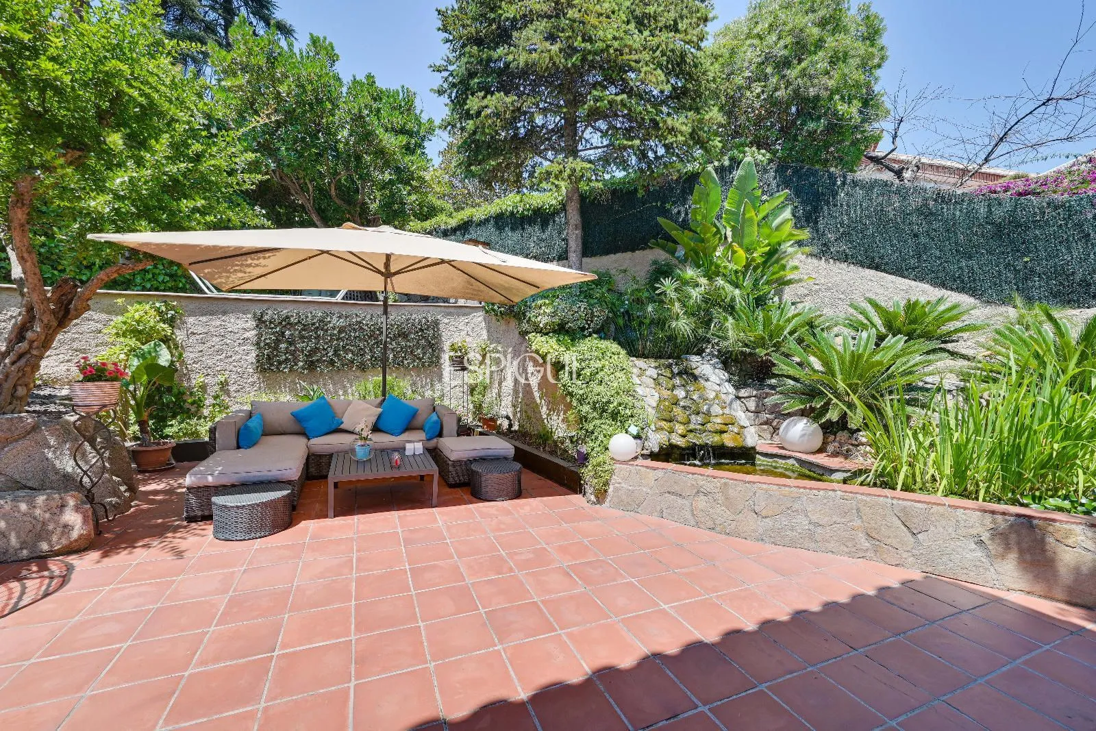 Le jardin, qui entoure toute la maison, a été conçu pour profiter au maximum du plein air. Il dispose d’un grand porche, d’un espace barbecue, d’un espace de détente et d’une spectaculaire piscine d’eau salée avec vue directe sur la mer, entourée d’un espace vert aménagé en solarium. Un petit étang avec des poissons apporte une touche de sérénité et de beauté singulière à l’ensemble.