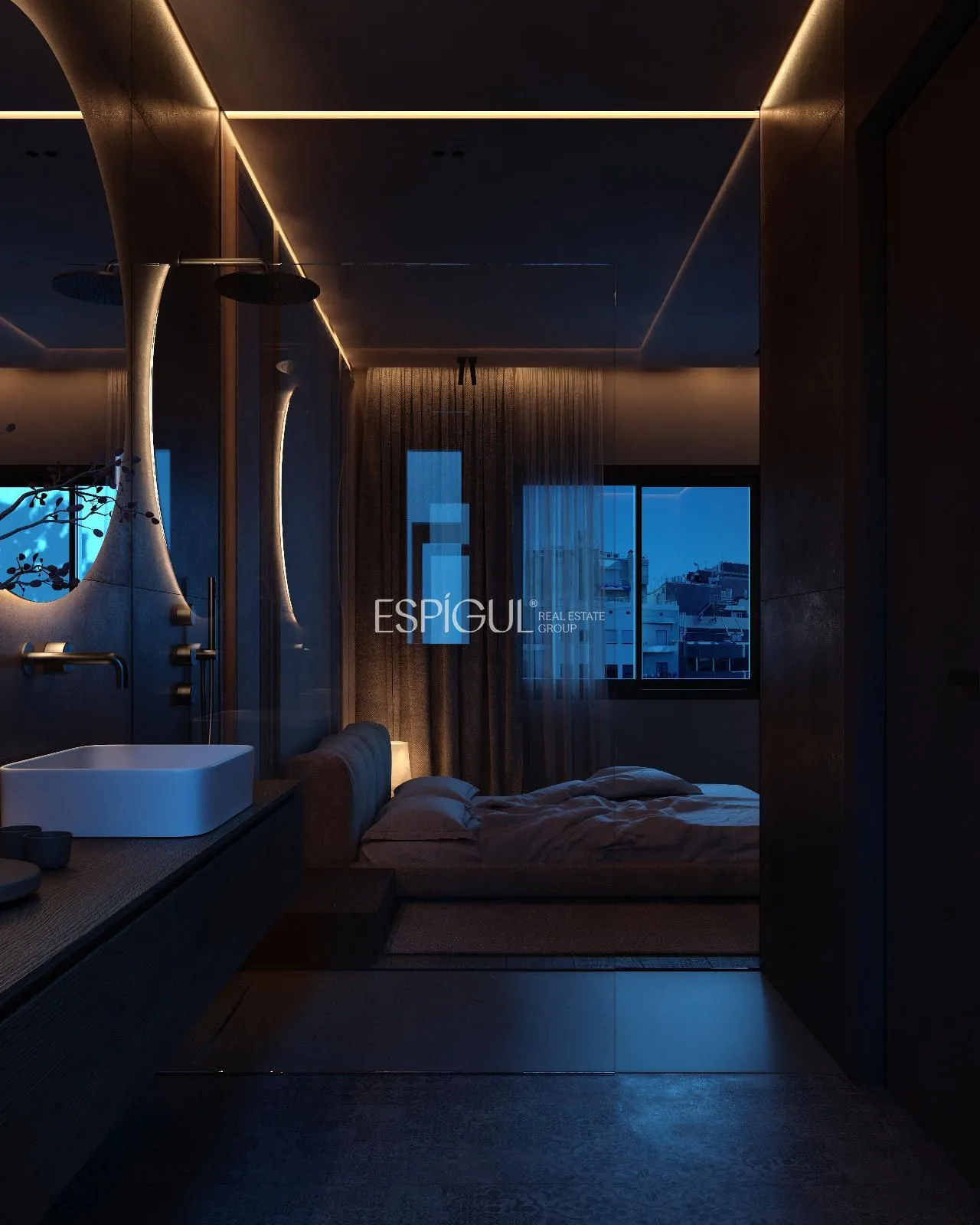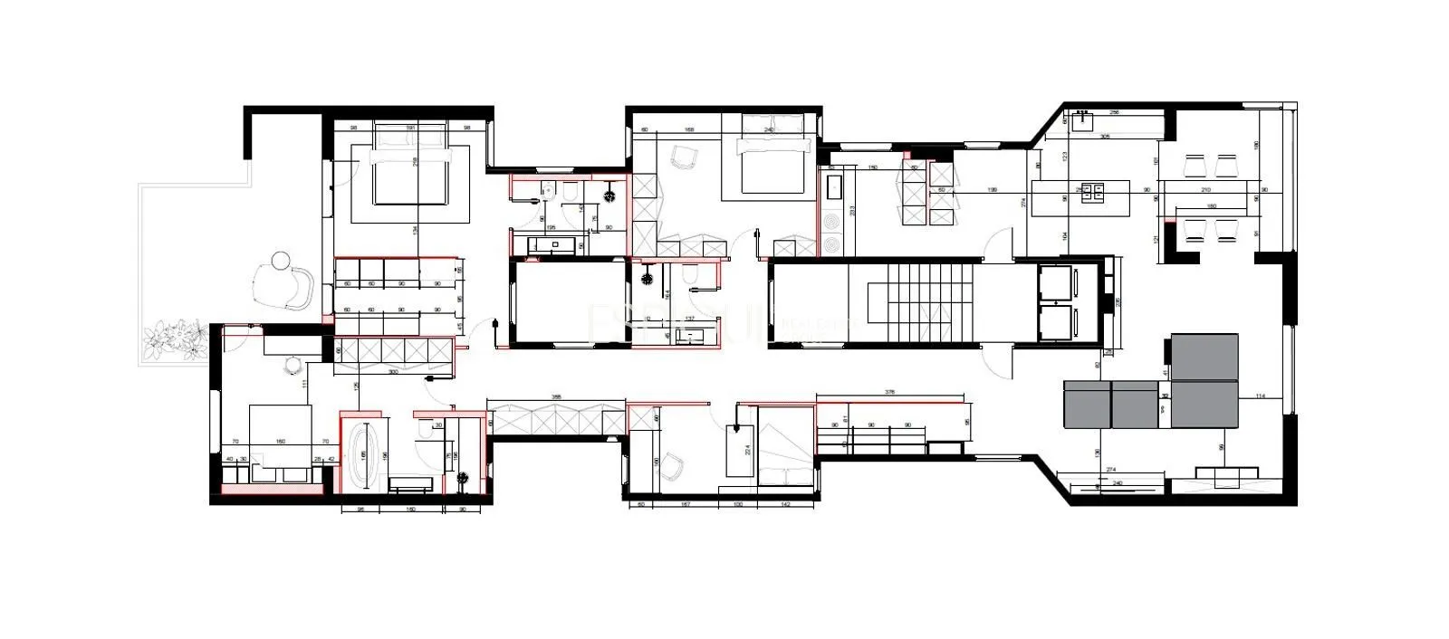 Планировка дома продумана для комфорта и функциональности. В нем есть четыре спальни, две из которых типа люкс с собственной ванной комнатой и прямым выходом на тихую террасу площадью 19 м² с видом на внутренний двор. Две другие спальни, также двухместные, имеют общую ванную комнату. Сердцем дома является просторная гостиная-столовая, залитая естественным светом и с выходом на очаровательную крытую террасу, с которой открывается панорамный вид на город и модернистское здание, представляющее большую архитектурную ценность.
