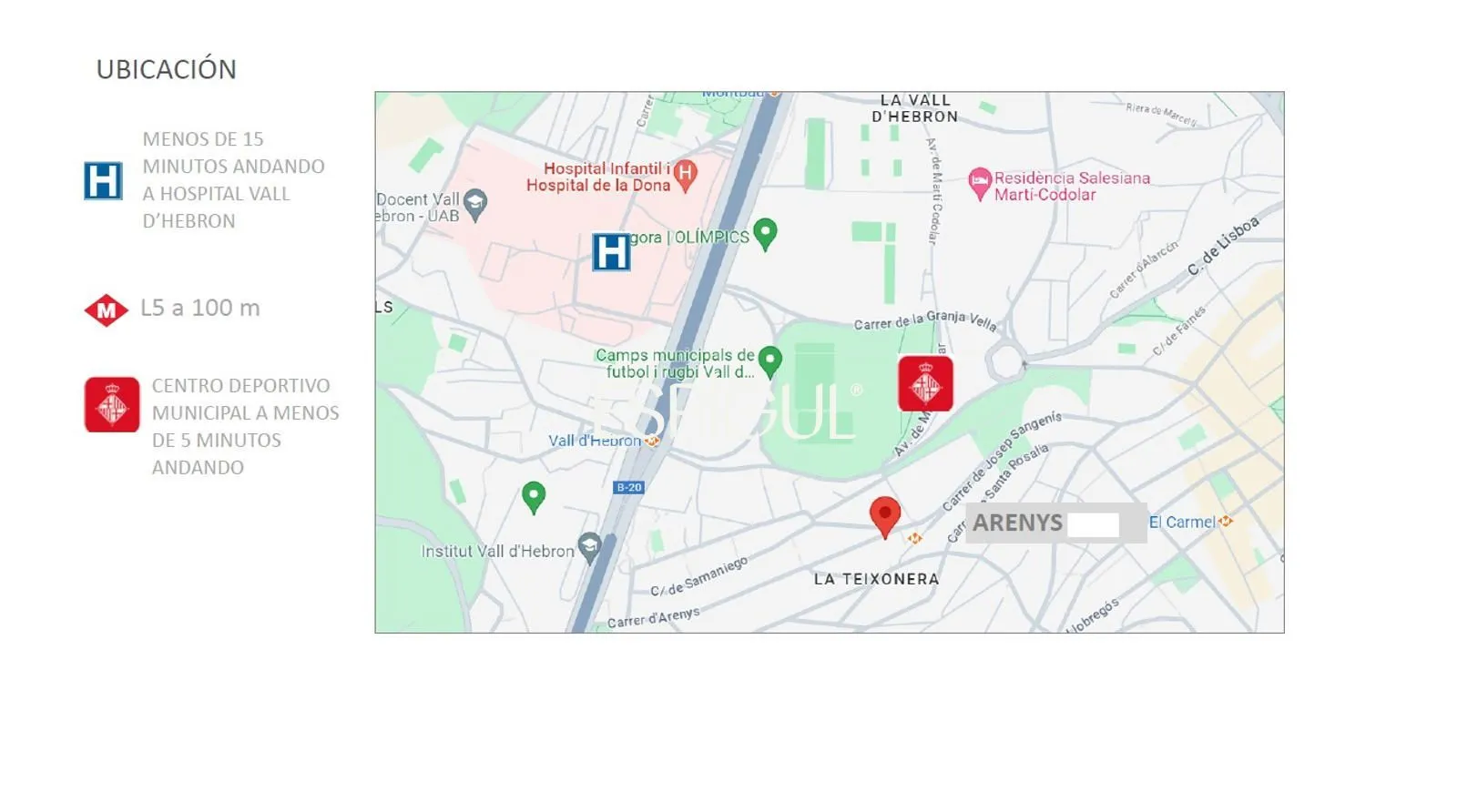 Расположение особенно стратегическое: всего в 15 минутах пешком от Hospital Vall d’Hebron — одного из крупнейших больничных комплексов города, что повышает ценность объекта как для проживания, так и для инвестиций. Район Орта-Гинардо отличается спокойной атмосферой, зеленым окружением и отличной связью с центром Барселоны, сочетая высокое качество жизни со всеми необходимыми услугами, магазинами и общественным транспортом в шаговой доступности.
