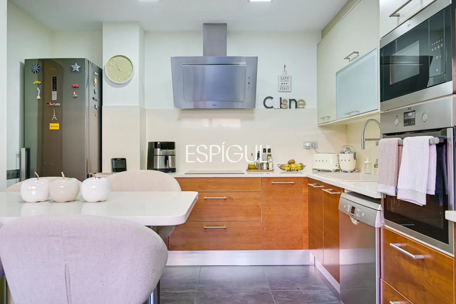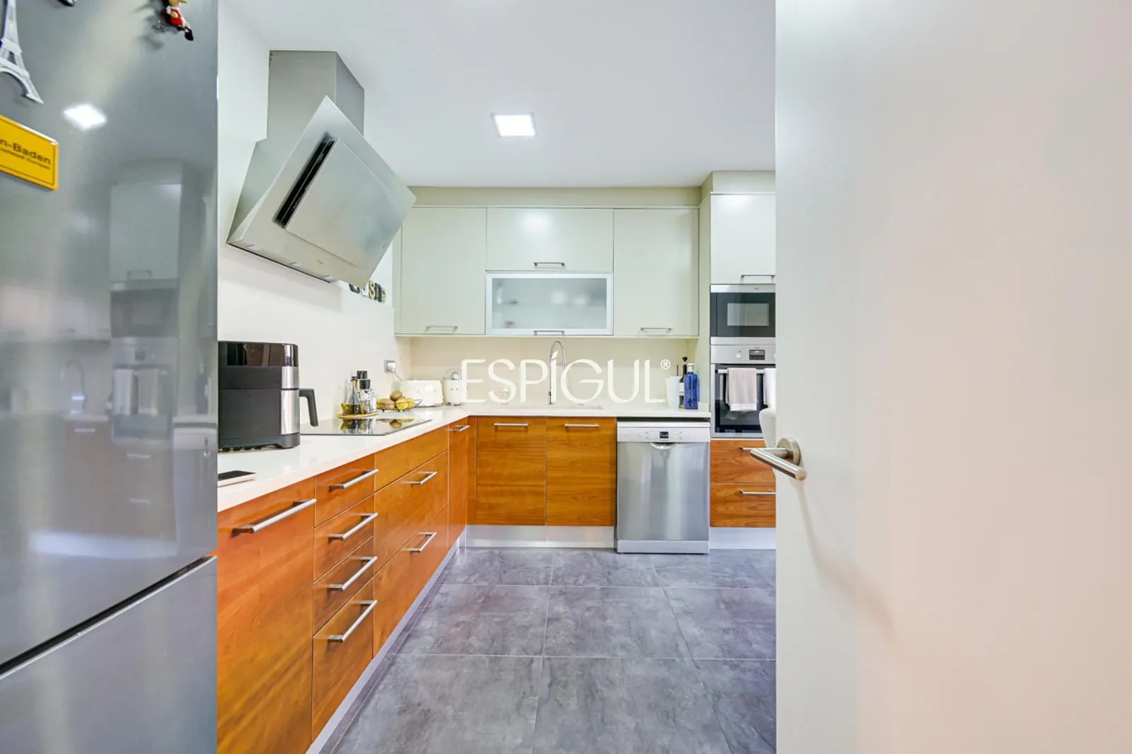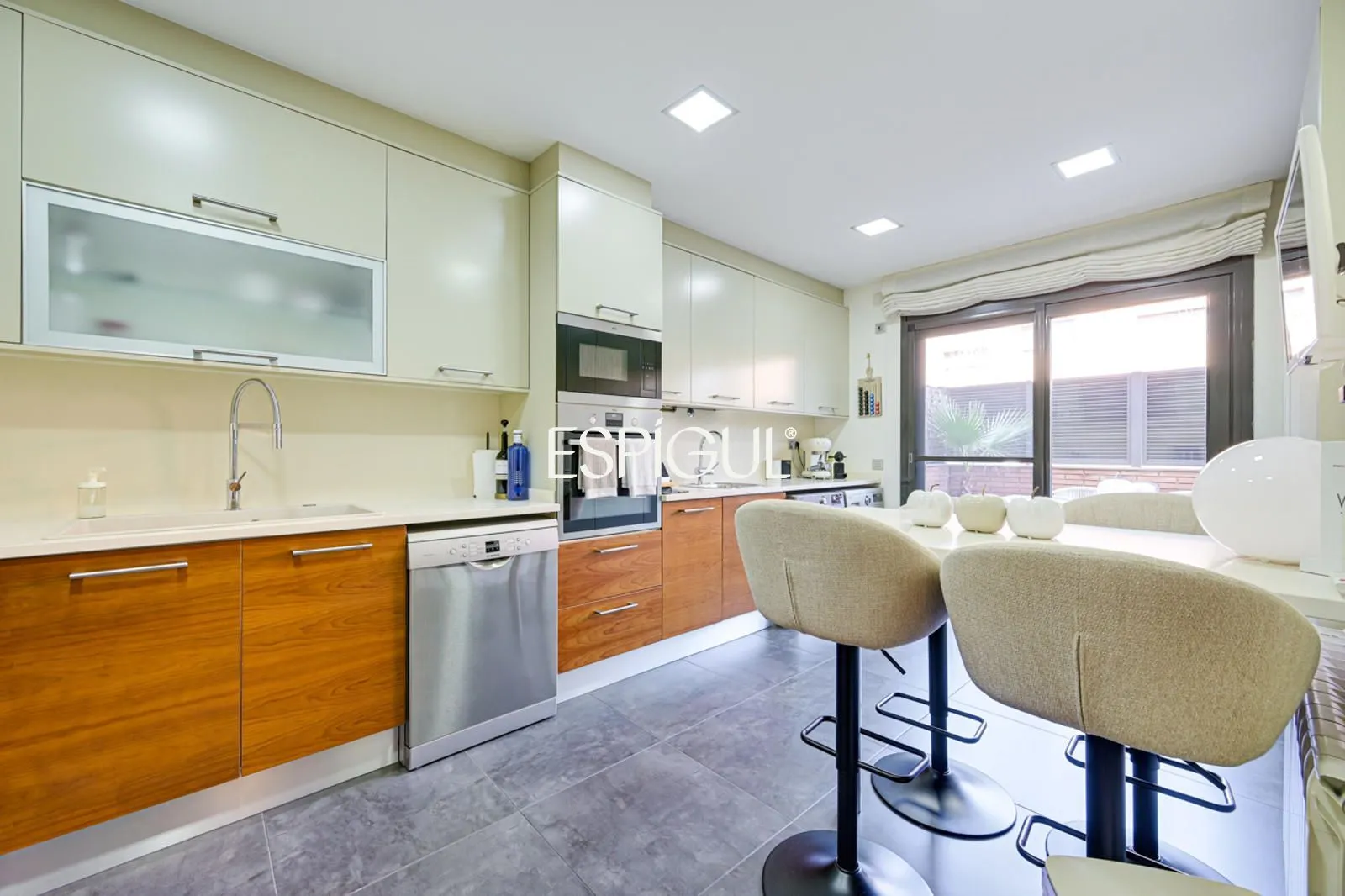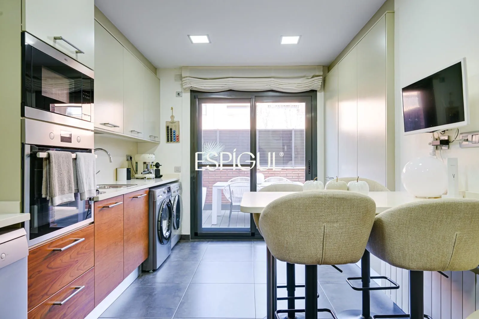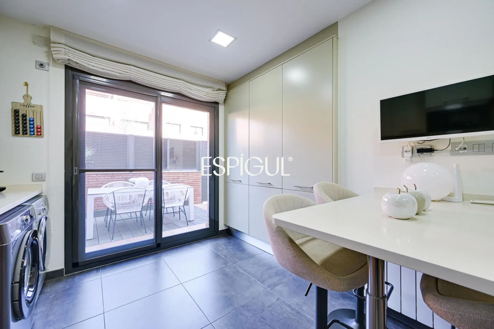 Кухня, полностью оборудованная современной и качественной бытовой техникой, также располагает террасой, которая служит естественным продолжением пространства, позволяя с комфортом наслаждаться трапезами на свежем воздухе.