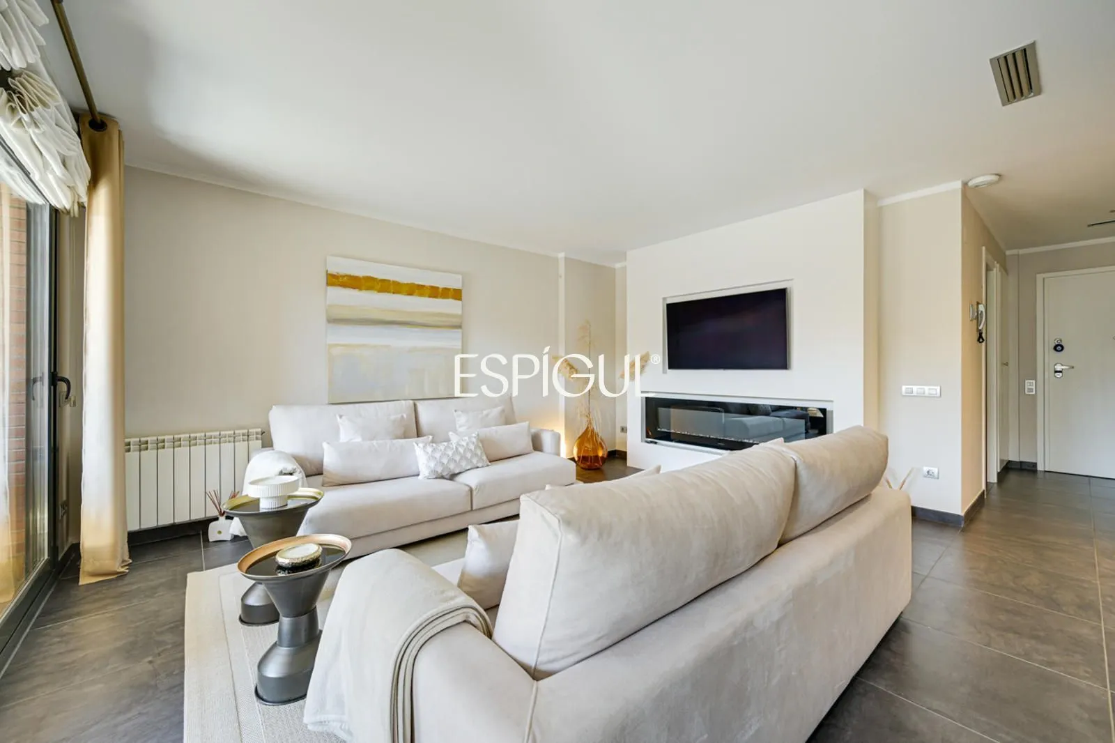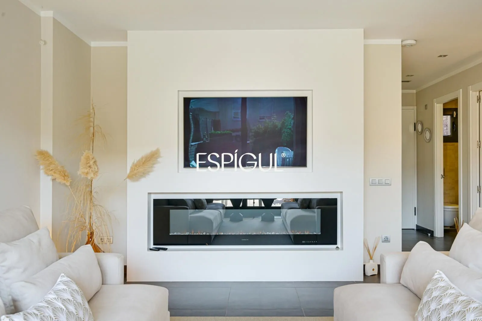 Гостиная дополнена электрическим камином, который придает уют и изысканность, идеально подходя для создания теплой атмосферы в прохладные месяцы.